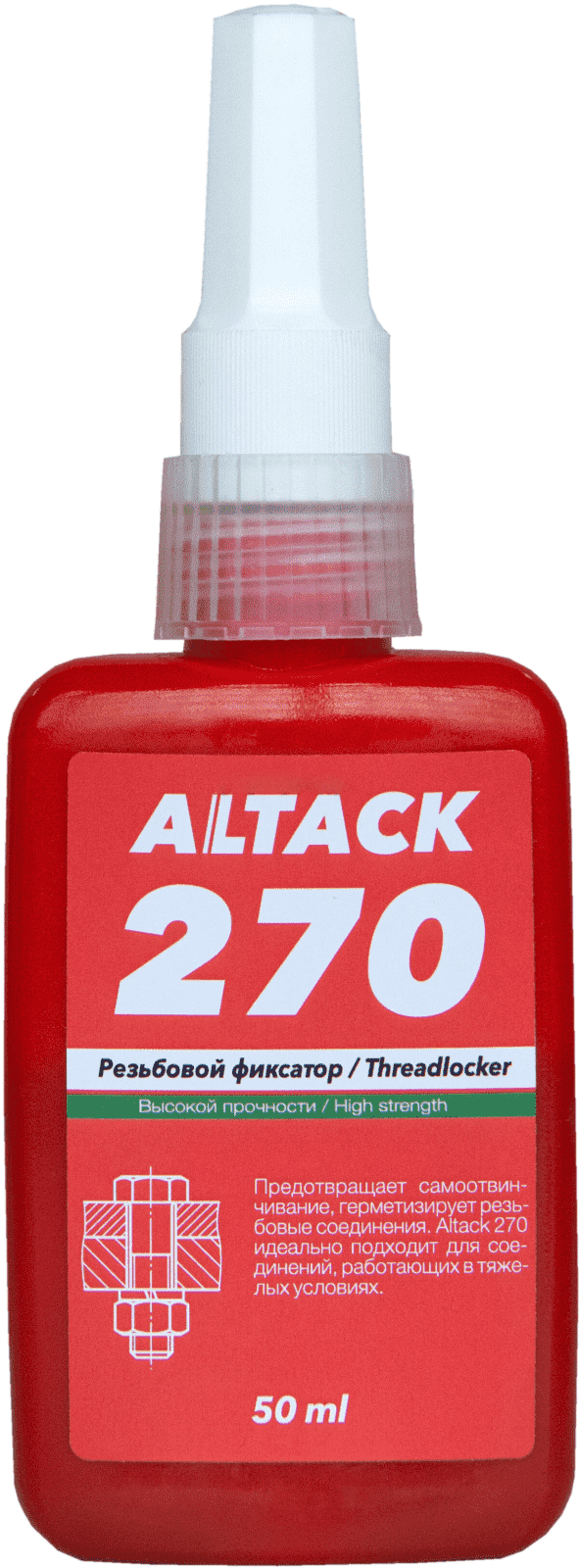 Фиксатор резьбы ALTACK 270 — это высокопрочный анаэробный состав, предназначенный для надёжной фиксации, герметизации и предотвращения самоотвинчивания резьбовых соединений в условиях вибрации, ударных нагрузок и температурных перепадов. Применяется в промышленном оборудовании, автомобилестроении, энергетике и строительстве для обеспечения долговечности и безопасности соединений.