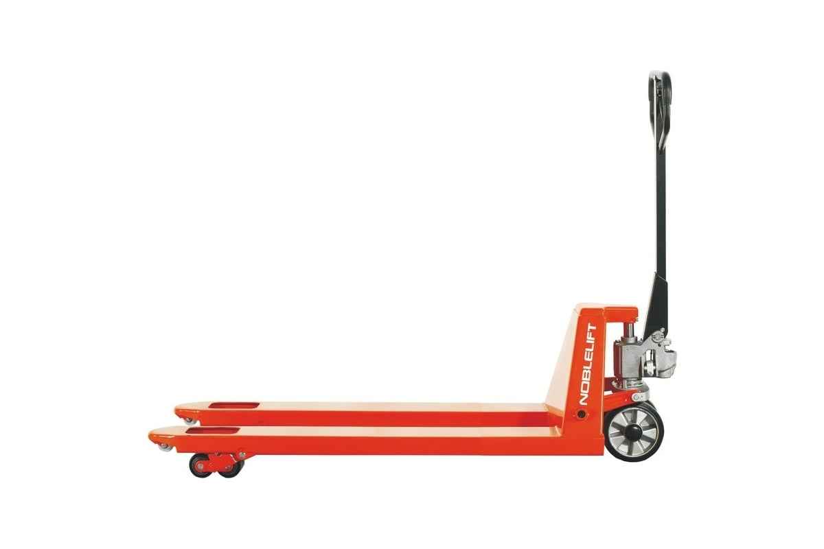 Гидравлическая тележка NOBLELIFT AC20 с грузоподъемностью 2000 кг, высотой подъема 195 мм, хромированным штоком и защитой от перегрузок. Предназначена для перемещения грузов на складах.