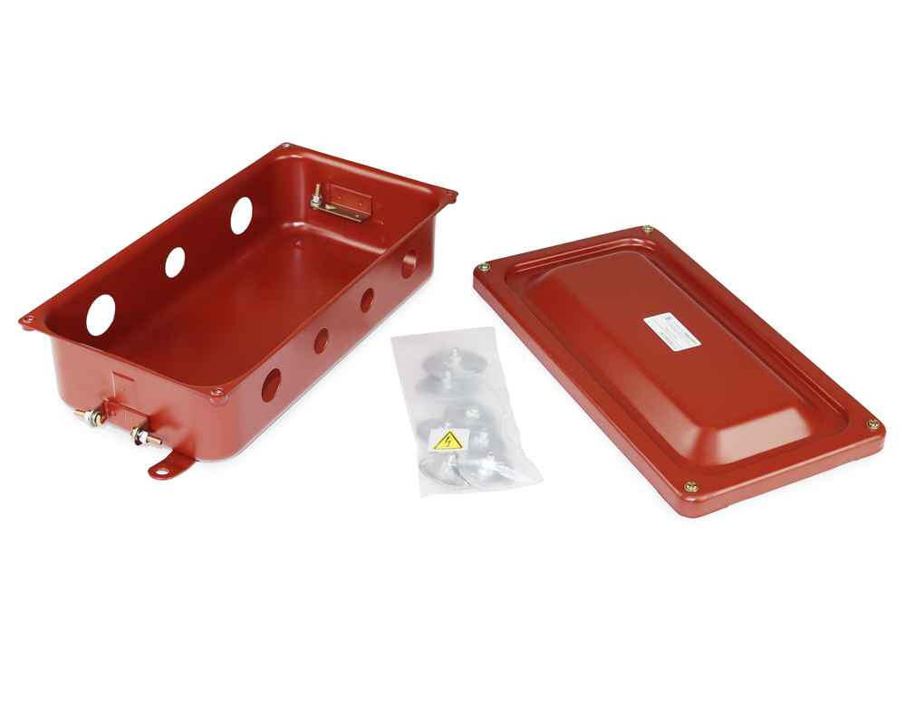Металлическая коробка с заглушками, предназначенная для установки в условиях, требующих защиты от пыли и влаги (IP65). Имеет 7 отверстий для кабелей различных диаметров.
