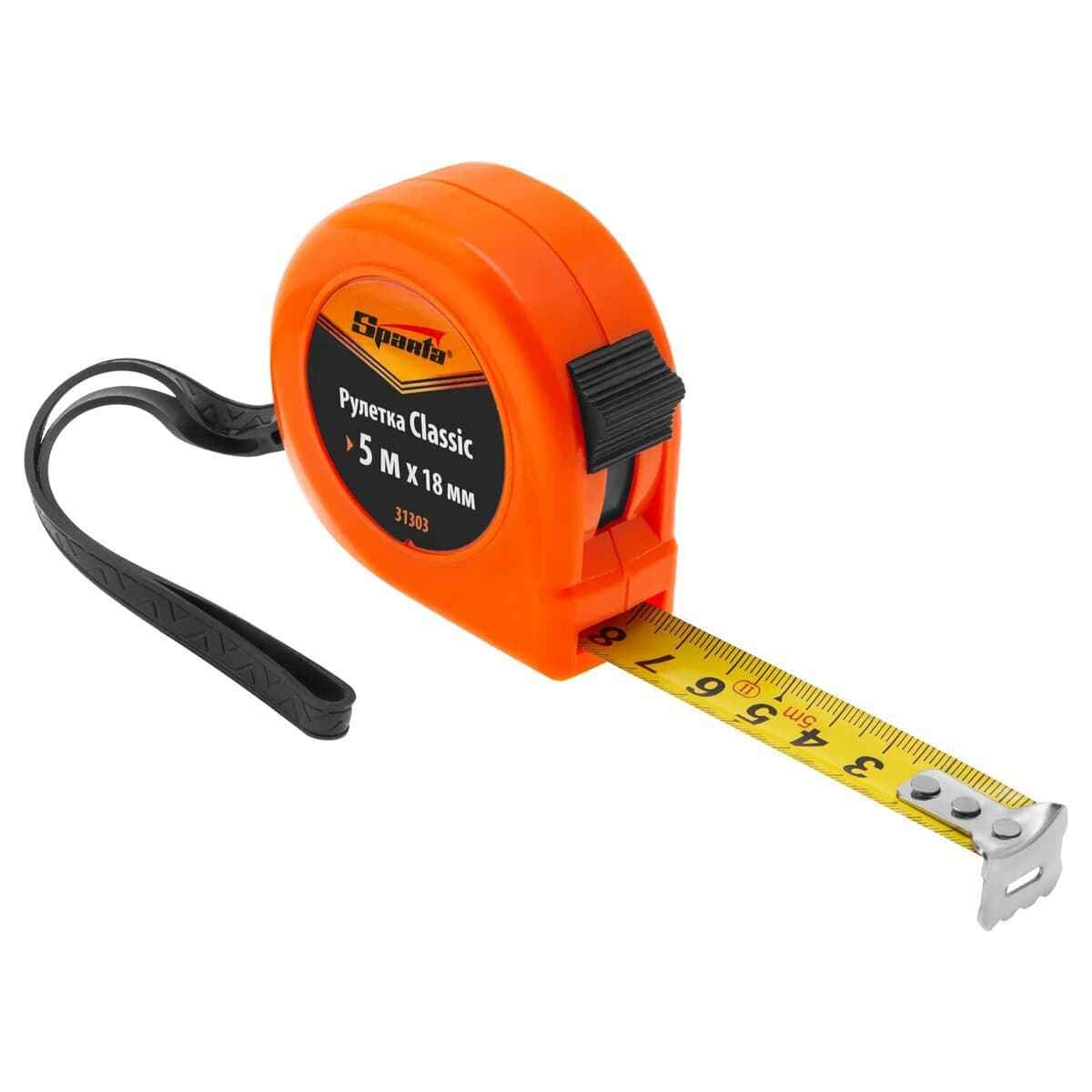 Рулетка с полотном 5 м х 18 мм, в пластиковом корпусе. За счет специального окошка на зацепе рулетка подходит для применения в качестве циркуля.