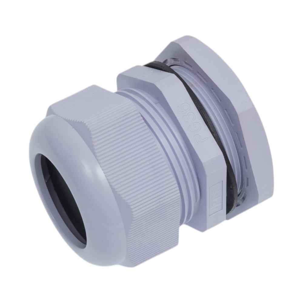 Сальник PG 36 из пластика, предназначенный для защиты соединений от пыли и влаги, имеет степень защиты IP68 и подходит для кабелей диаметром от 22 до 32 мм.